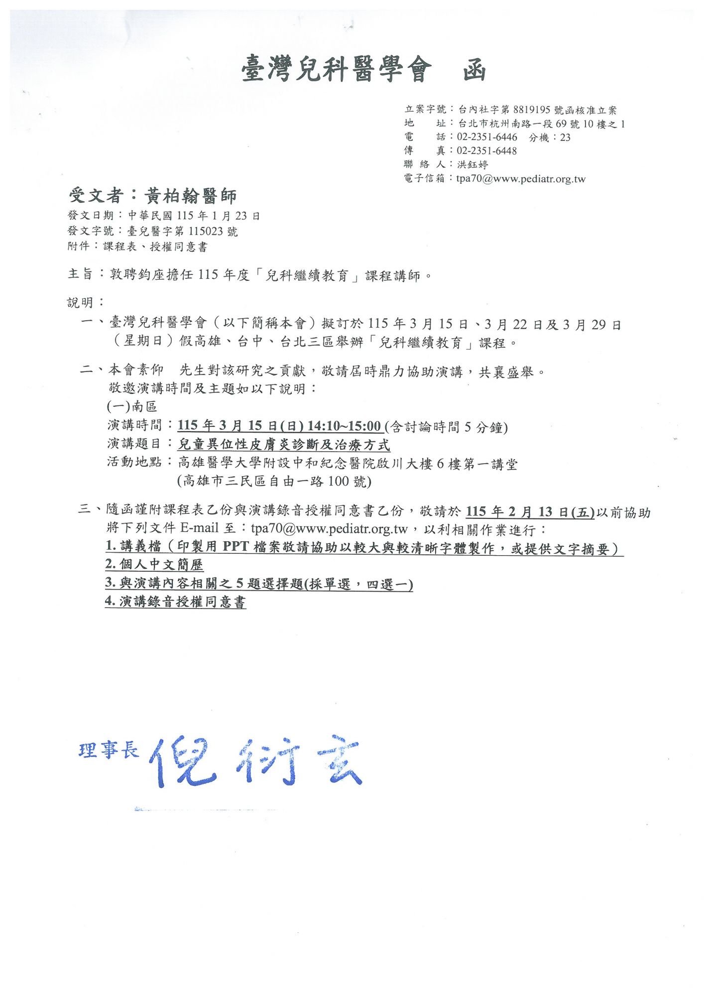 台灣兒科醫學會 115 年度「兒科繼續教育」課程講師